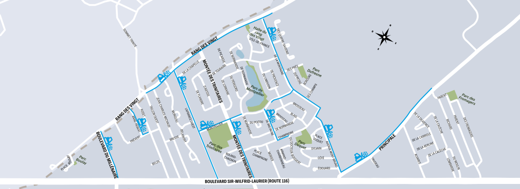 Tout au long de la saison froide, la Ville assure le déneigement ainsi que le déglaçage des rues et des trottoirs pour la sécurité des usagers. Par priorité, les artères principales ainsi que les rues d’écoles sont les premières à être dégagées, puis des équipes sont affectées aux différents secteurs de la ville. Lorsqu’il s’agit de déglacer, l’épandage d’abrasif se fait simultanément sur les trottoirs et sur les rues.